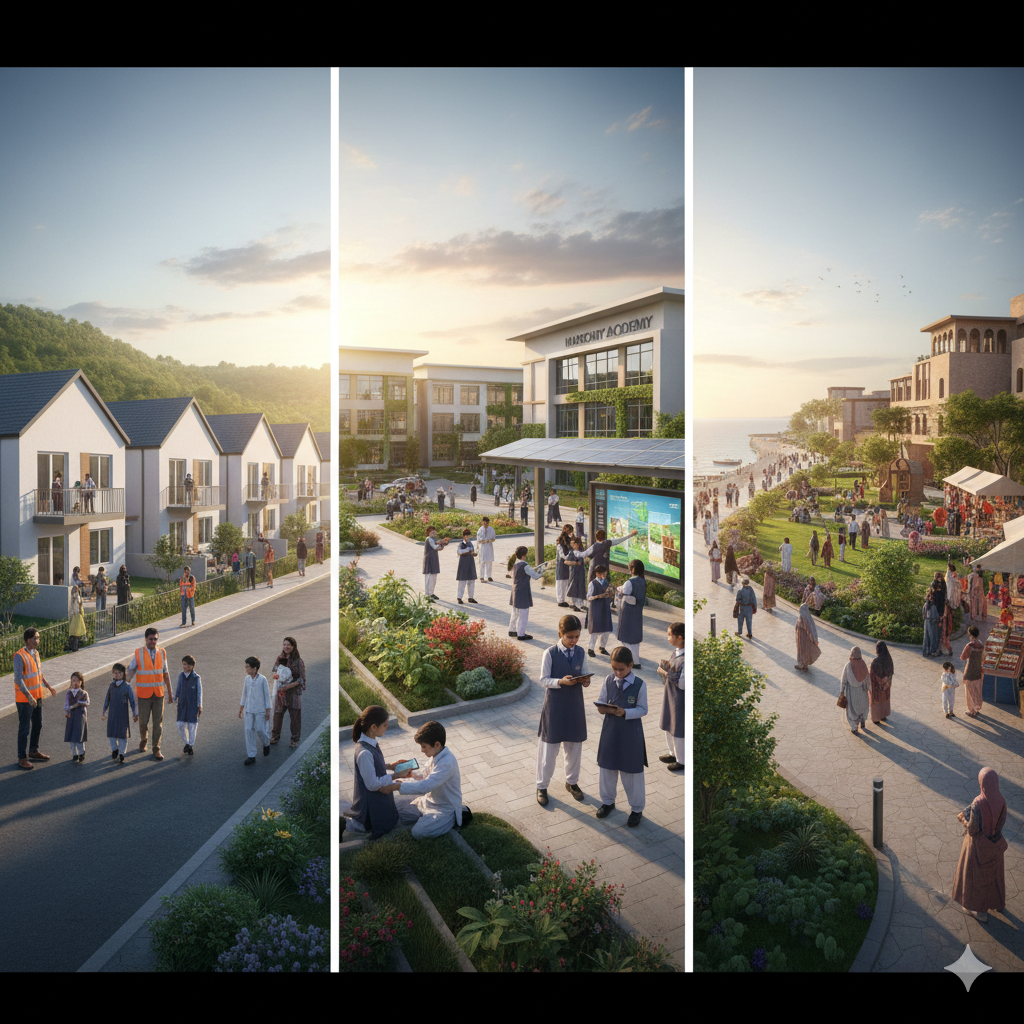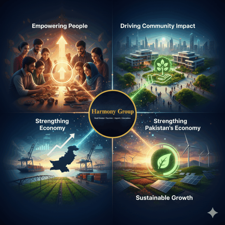 To position Harmony Group as Pakistan’s most trusted, value-creating House of brands — delivering stakeholder prosperity and leading excellence in Real Estate, Renewable Energy, Exports, Education and Tourism